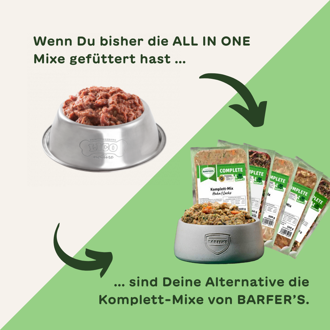 BARFER’S führt mit den Komplett-Mixen aus der Complete Produktfamilie vergleichbare Produkte im Sortiment. Hier kannst Du als Kunde zwischen unterschiedlichen Beutetier-Arten und unterschiedlichen Formaten entscheiden. BARFER’S führt sowohl Complete-Produkte für Hunde, als auch für Katzen. Die Komplett-Mixe von BARFER’S sind dabei von der DLG (Deutsche-Landwirtschafts-Gesellschaft) als Alleinfuttermittel zertifiziert worden. Hier findest Du eine Übersicht aller Complete-Produkte.